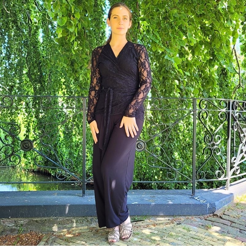 Hier ook gedragen met een zwarte doorzichtige wikkelblouse en met een kanten wikkelblouse.