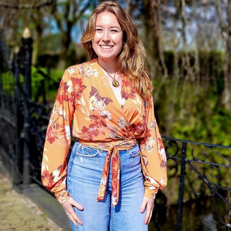 Deze wikkelblouse heeft een romantische bloemenprint met vlinders (laatste stuks!)